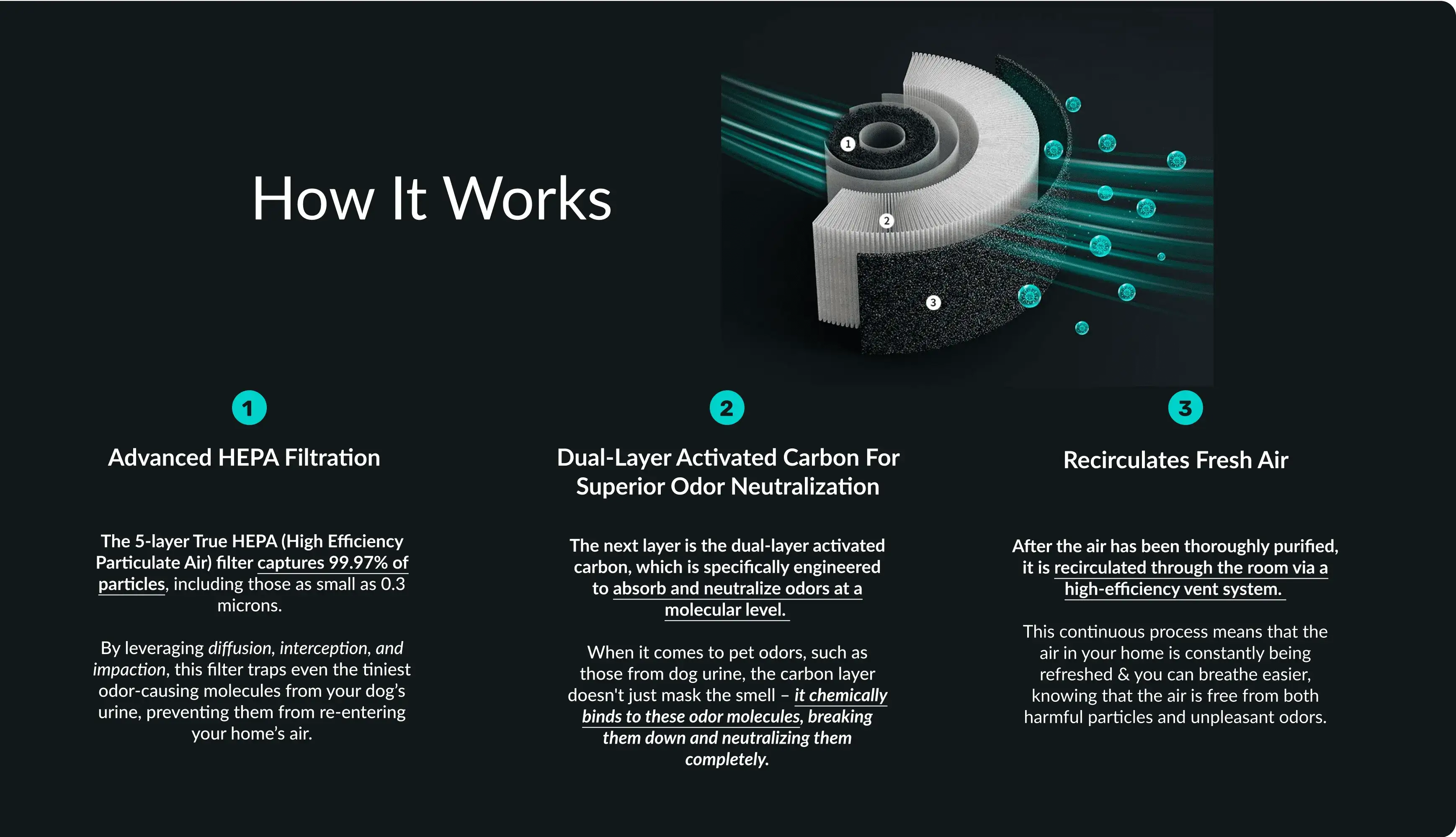 It captures and eliminates 99.97% of pet odors, allergens, and harmful particles from the air.